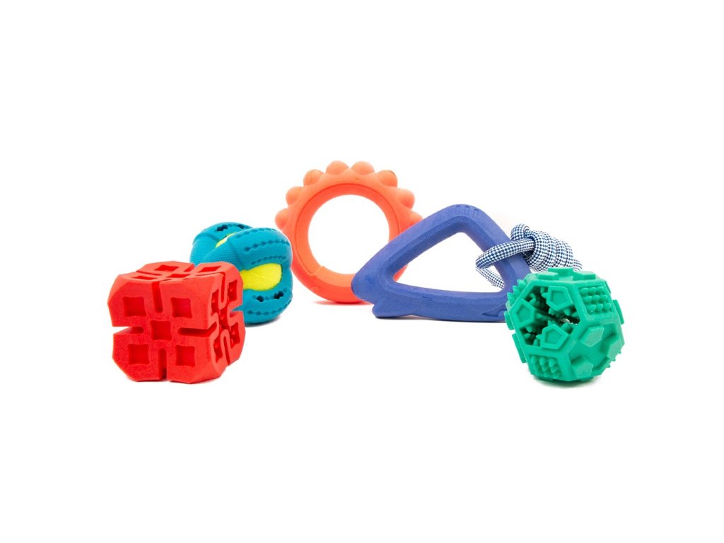 Hračky mají nepravidelný tvar, takže poskakují nepředvídatelně a udržují pozornost psa